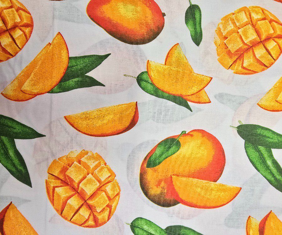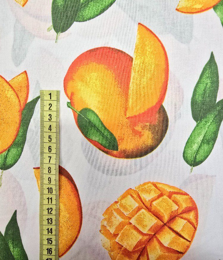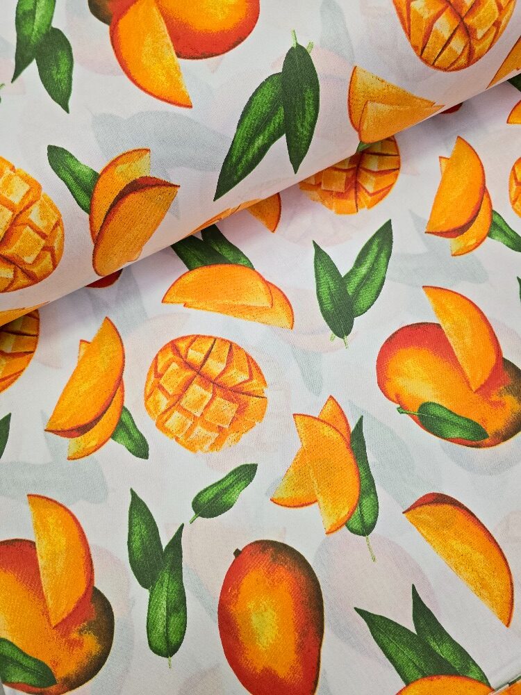 Exotická bavlněná látka s výrazným motivem šťavnatých mang a listů na bílém podkladu. Veselý letní vzor, který rozzáří každý projekt. Bavlna je prodyšná, měkká na dotek a dobře se s ní pracuje.