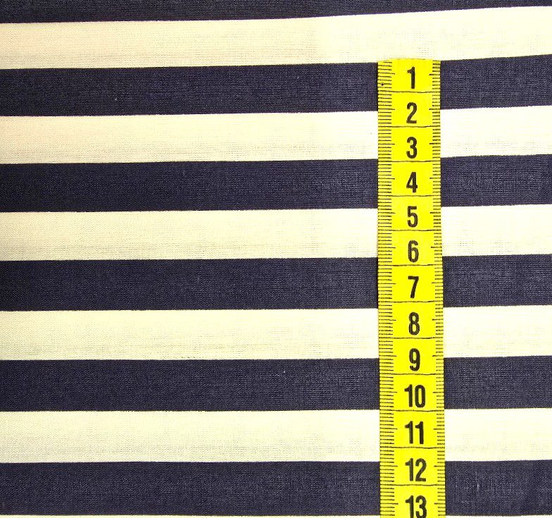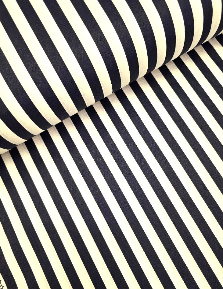 Stylová bavlněná látka se širším pruhem v hluboké půlnoční modré barvě. Kontrastní, ale elegantní vzor, který vynikne jak samostatně, tak v kombinaci s jednobarevnými látkami. Šíře pruhu 15mm, vzor na délku látky.