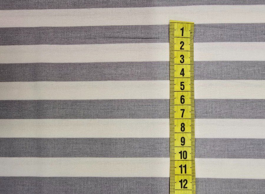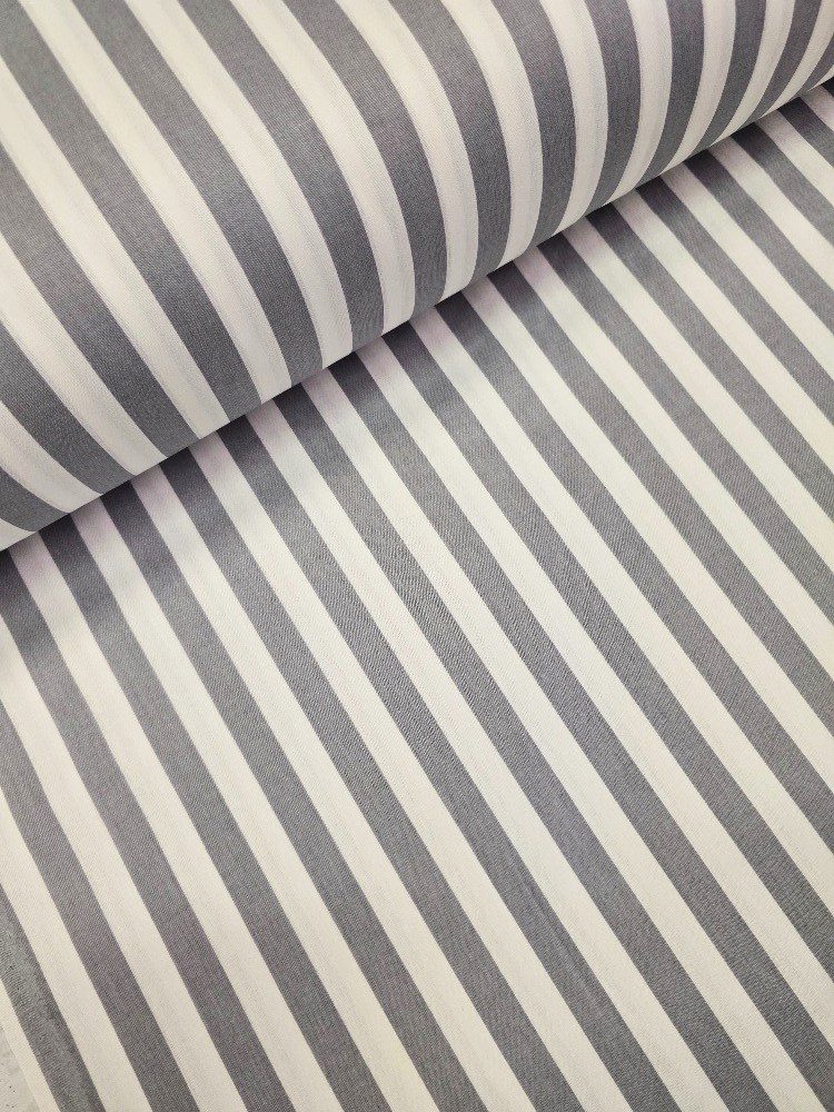 Bavlněná látka s výraznějším, širším pruhem v šedé barvě. Vzor je pravidelný, moderní a výraznější než u drobných proužků, přesto zůstává dobře kombinovatelný. Šíře pruhu 15mm, vzor na délku látky.