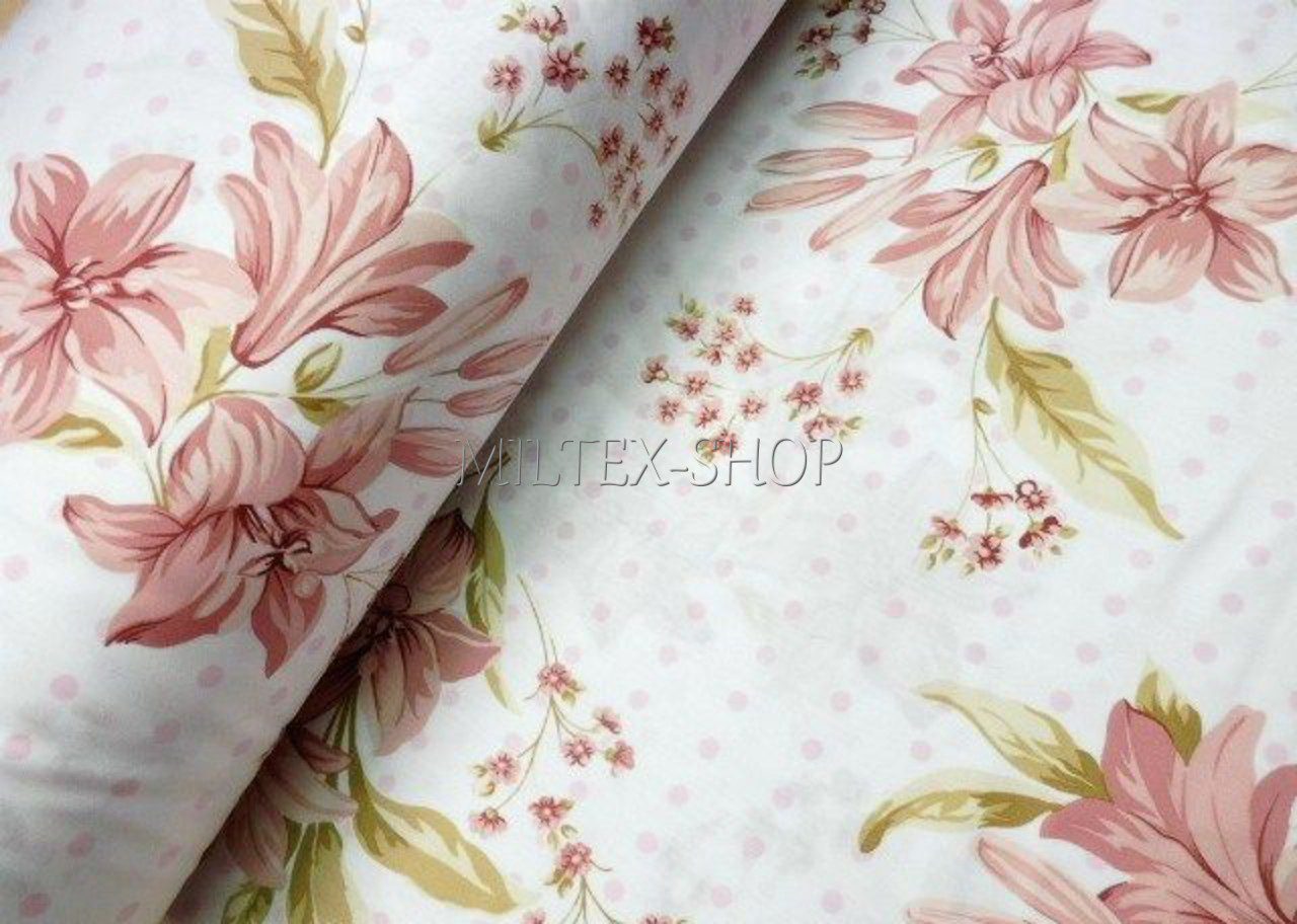 Bavlněný satén metráž lilie starorůžová na bílém podkladu v extra šíři 240 cm  je něžná a romantická látka s jemným květinovým motivem. Hustě tkaný 100% bavlněný satén vyniká hebkým omakem, decentním leskem a velmi dobrou prodyšností. Díky kvalitní česané přízi je materiál pevný, příjemný na dotek a ideální pro ložní prádlo i elegantní oděvy.