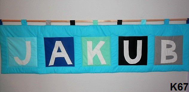 Kapsář 50x200cm jméno JAKUB je krásný a zároveň praktický doplněk do dětského pokoje. Pomáhá udržet pořádek v hračkách, knížkách i drobnostech a současně chrání zeď před ušpiněním a studeným povrchem. Díky personalizaci se jménem vzniká originální kousek šitý přímo pro Vaše dítě.