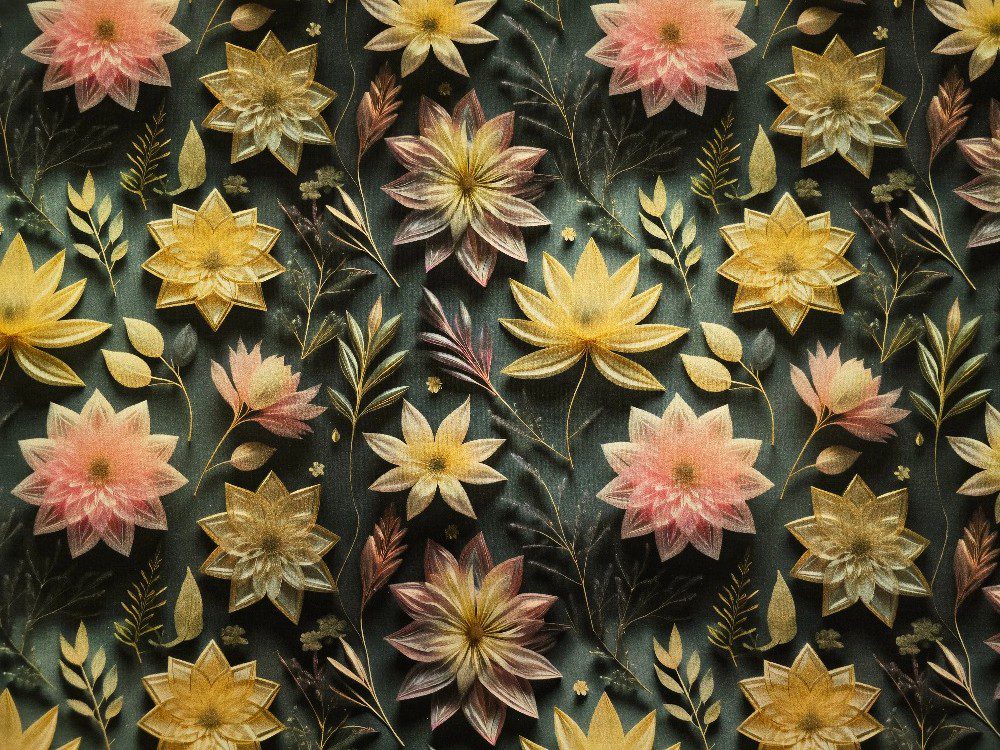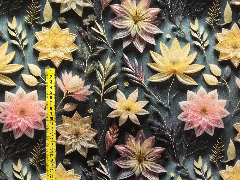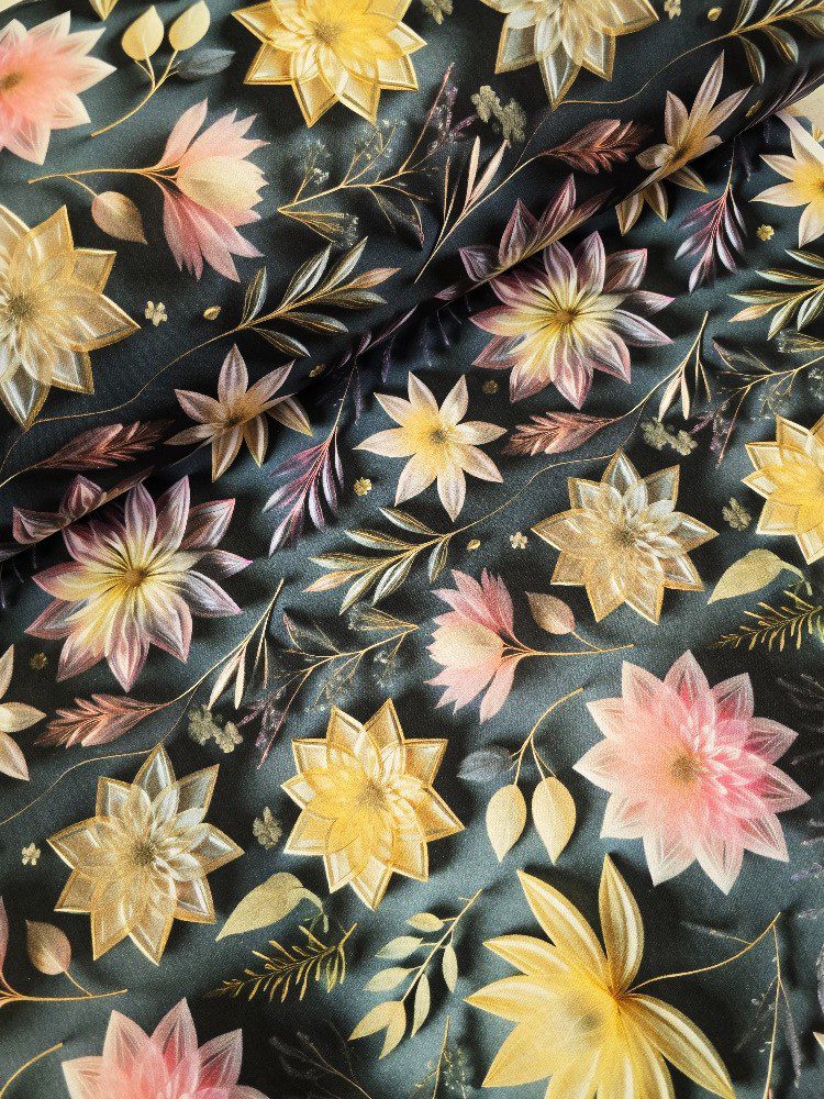Výrazná bavlněná látka s 5D tiskem zobrazuje velké květy a listy v jemných pastelových a zlatavých tónech na tmavém podkladu. Kontrast tmavé a světlé dodává látce hloubku a moderní eleganci.