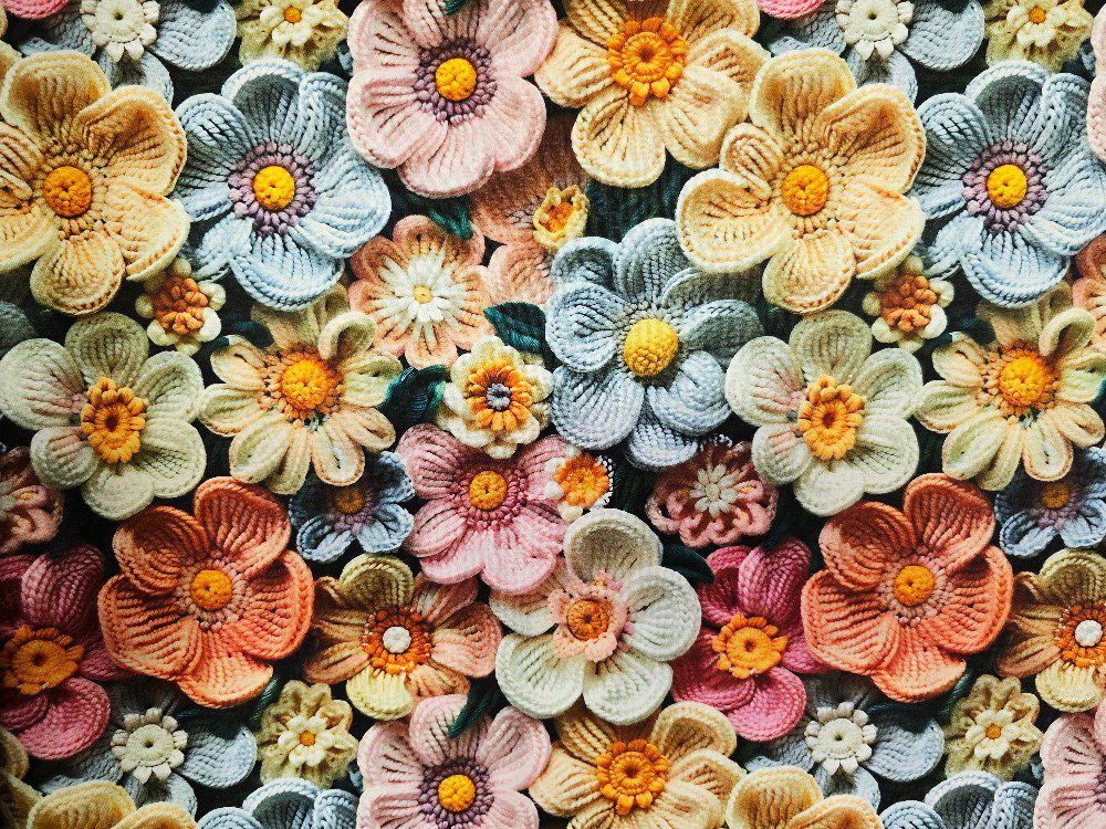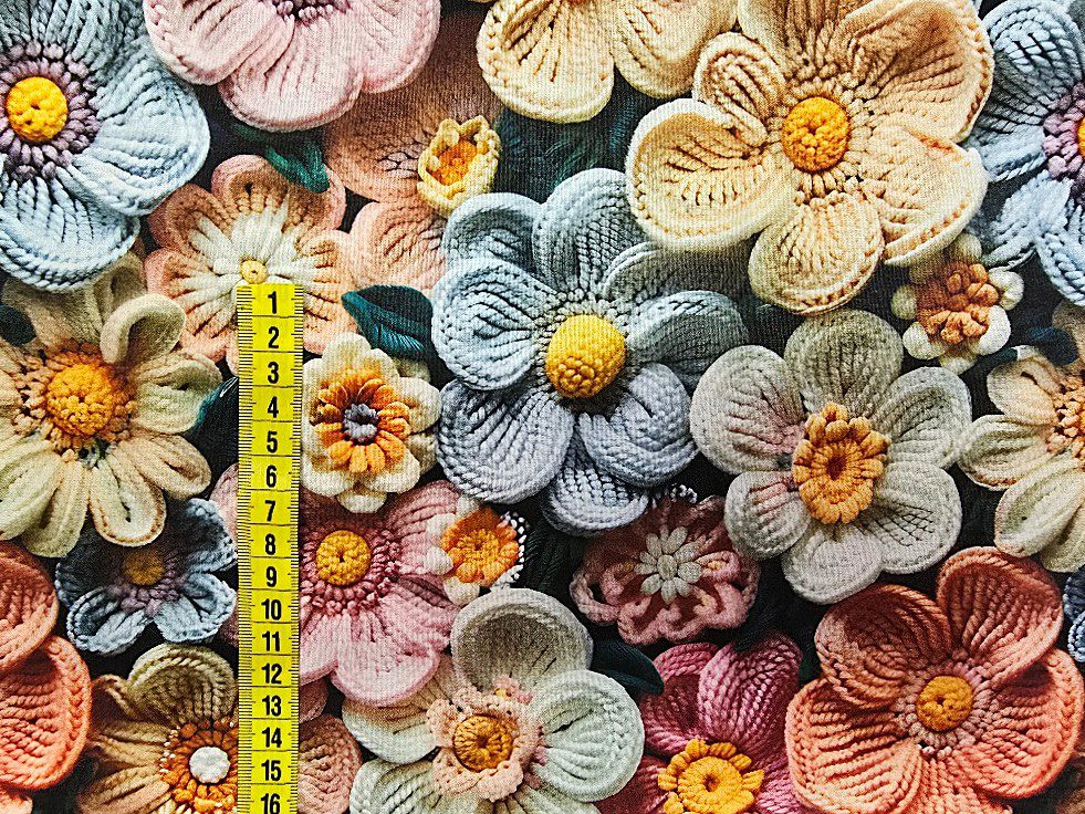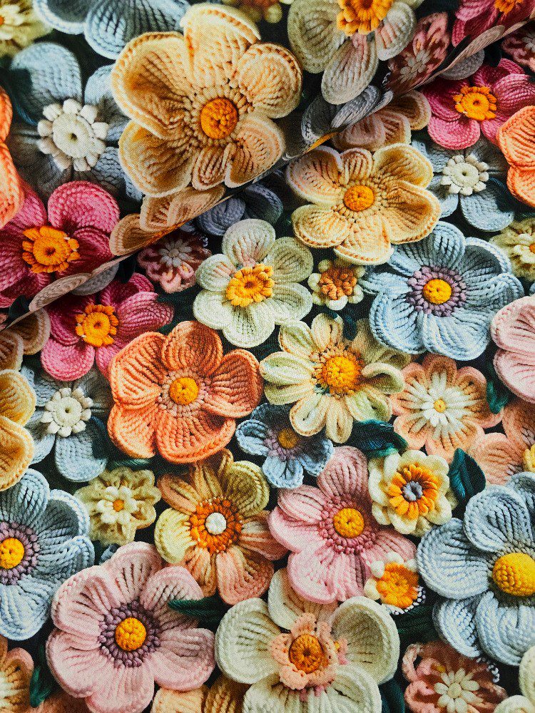 Látka metráž 5D digitální tisk kytky na tmavém připomíná barevnou výšivku květů v odstínech žluté, růžové, modré a béžové na tmavém podkladu. Květiny v odstínech žluté, růžové, modré a béžové působí plasticky a velmi živě.