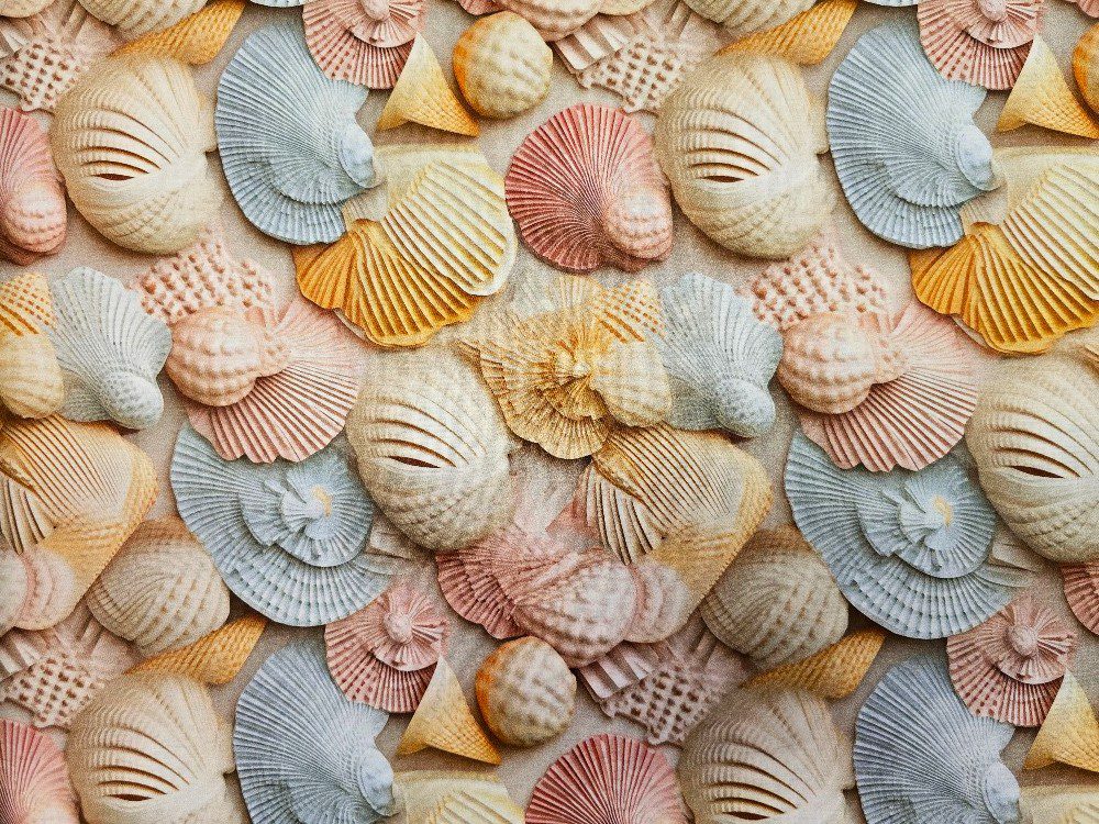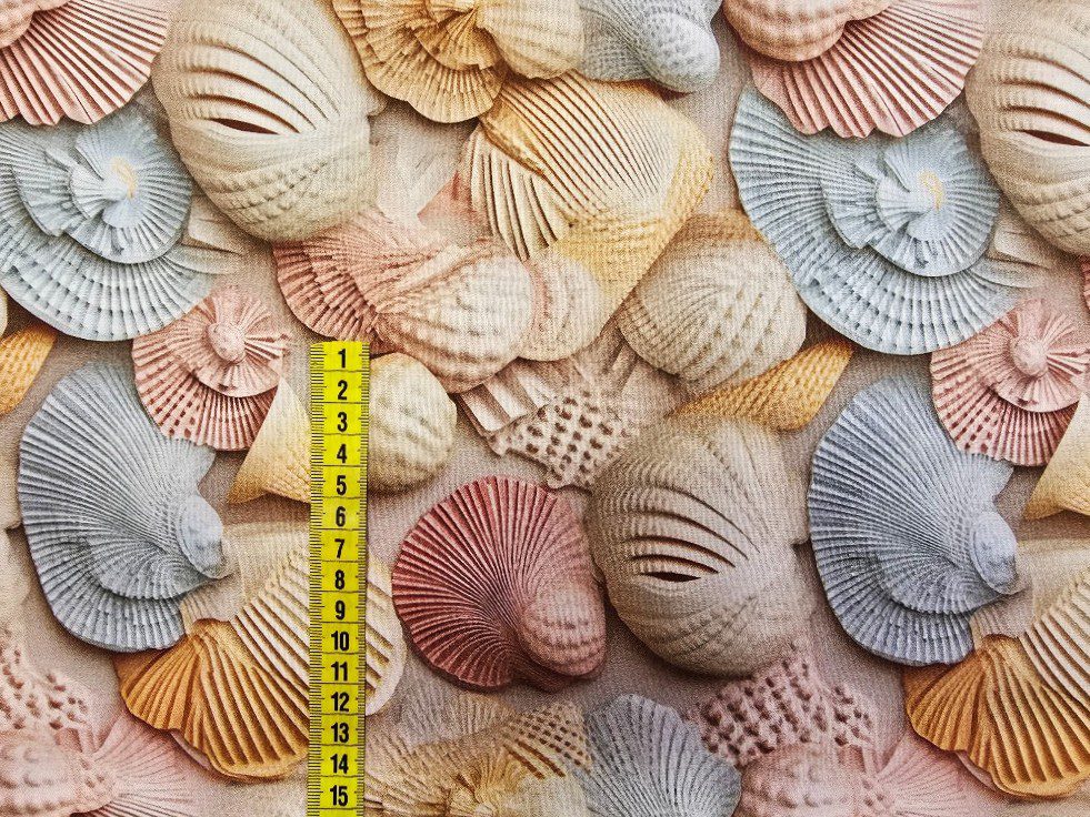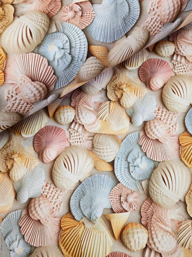 Originální bavlněná látka se 5D digitálním tiskem zobrazuje reliéfní mušle v jemných pastelových tónech béžové, modré, růžové a pískové. Vzor působí plasticky, téměř jako skutečné přírodniny rozložené na podkladu. Design je klidný, harmonický a inspirovaný mořem.