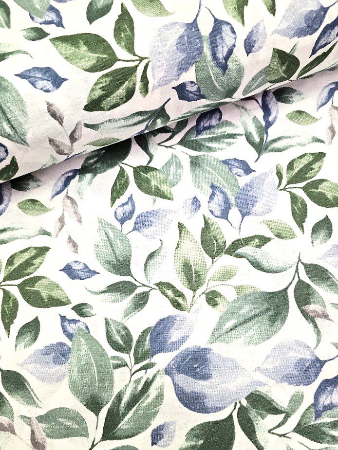 🍃 LÁTKA metráž – LÍSTKY modré a zelené šíře 240 cm