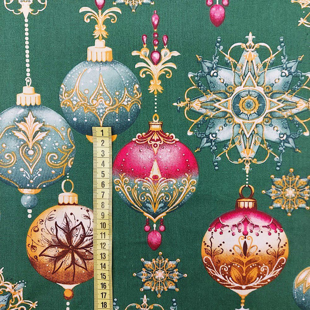 Je bavlněná látka metráž vánoční ozdoby na zelené vhodná pro děti?