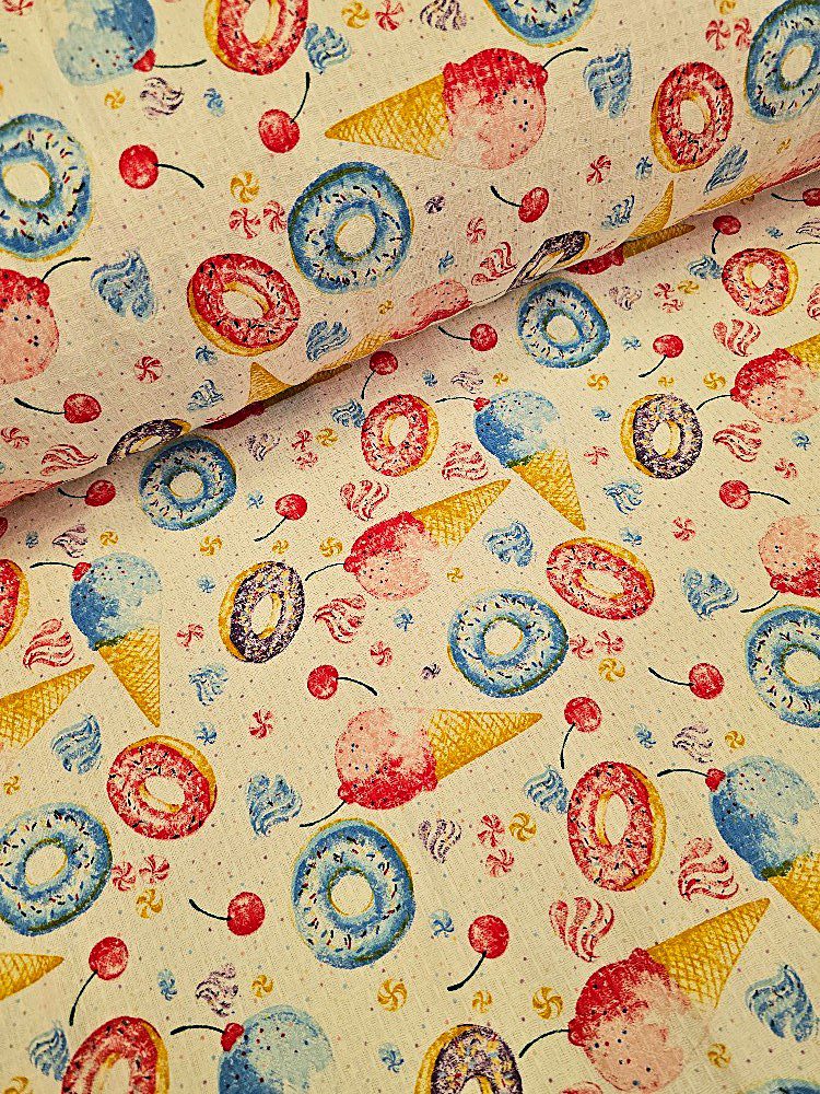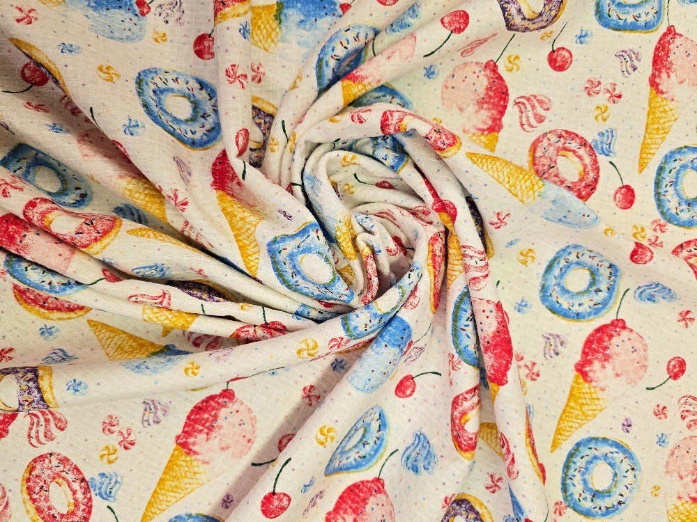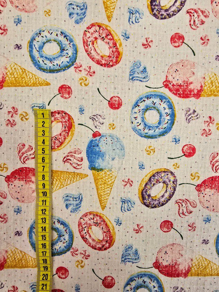 Vafle metráž donuty a zmrzlina v extra šíři 240 cm na smetanovém podkladu zaujme hravým sladkým motivem, který je ideální pro dětské i letní projekty. Látka má typickou plastickou vaflovou strukturu, je pevná, přitom příjemně měkká a velmi prodyšná. Skvěle saje vlhkost a rychle schne.
